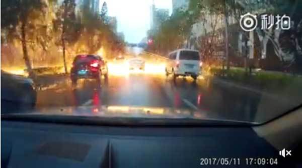 Camera hành trình gắn trên một chiếc ô tô đang lưu thông trên đường đã ghi lại được khoảnh khắc sét bất thần giáng xuống một con đường đông xe cộ.