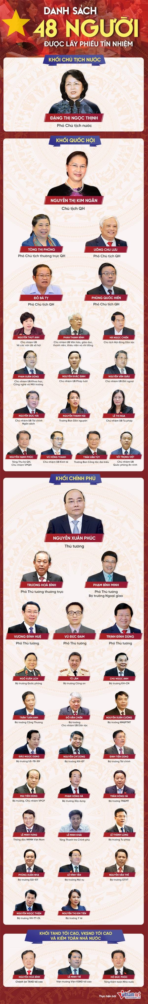 Trong 48 vị được QH lấy phiếu tín nhiệm lần này, khối Chủ tịch nước có 1 người, khối QH có 18 người, khối Chính phủ có 26 người cùng với Chánh án TAND Tối cao, Viện trưởng Viện KSND Tối cao và Tổng Kiểm toán Nhà nước.