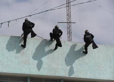 | Leo qua mái nhà khống chế khủng bố. (Ảnh: Bee.net.vn) |