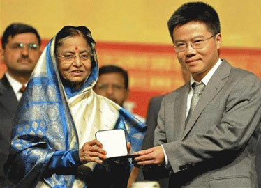Bà Pratibha Patil - Tổng thống Ấn Độ trao huy chương Fields - giải thưởng toán học cao quý nhất thế giới cho GS Ngô Bảo Châu.