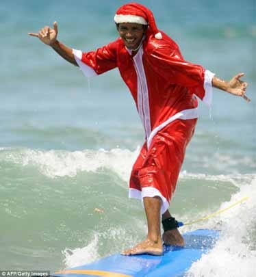 6. Một người đàn ông Indonesia mặc đồ ông già Noel lướt ván trên bãi biển Kuta, đảo Bali
