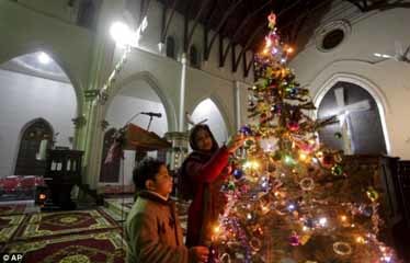 14. 2 mẹ con đang trang trí cây thông Noel tại một nhà thờ công giáo ở Peshawar, Pakistan.