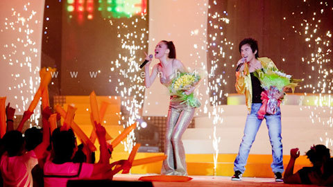 | Diễn chung với người bạn nhạc sĩ Nguyễn Hồng Thuận (Ảnh: kênh 14) |