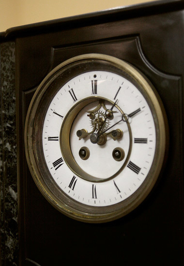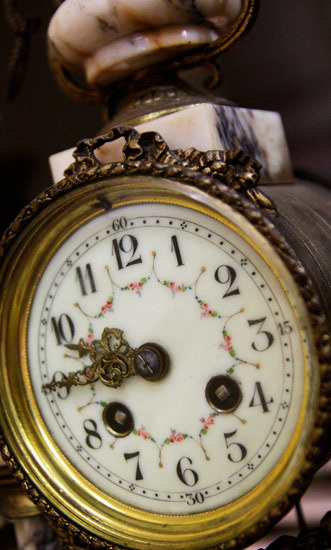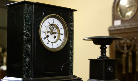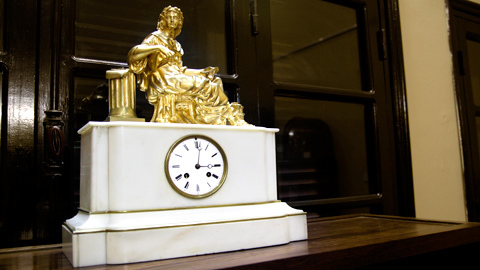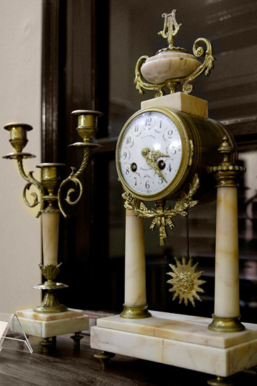 Đặc biệt, bộ sưu tập những chiếc đồng hồ để bàn thu hút được sự quan tâm của nhiều người. Trong số này có chiếc đồng hồ để bàn hai cột đá với mặt men có xuất xứ từ Pháp đời từ cuối thế kỷ 19. Tuy nhiên, đáng chú ý nhất lại là chiếc đồng hồ để bàn bằng đá cẩm thạch trắng đúc nguyên khối có khối lượng lên đến hơn 40kg, mặt men với bức tượng đồng mạ vàng đặt phía trên rất tinh xảo cũng ra đời vào khoảng cuối thế kỷ 19.