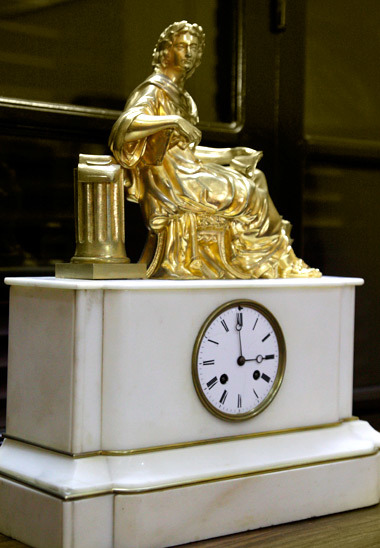 Đồng hồ để bàn của Pháp được đúc từ đá cẩm thạch trắng nguyên khối, trên là tượng đồng mạ vàng.