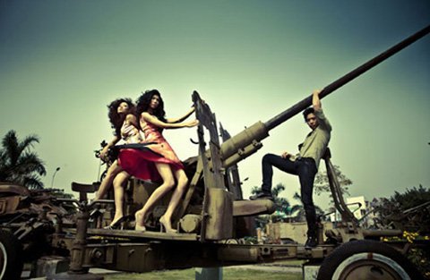| Nguyễn Thị Loan và bạn diễn leo trèo lên khẩu pháo và cô đã có màn tốc váy "ngoạn mục" |