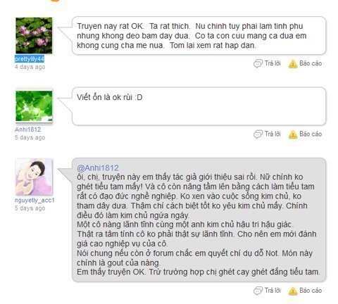 Văn Phương - một độc giả của báo sống tại Hà Nội chia sẻ: " Tôi thấy ngôn tình bây giờ không khác gì diễm tình hồi xưa, chỉ khác ở các chi tiết của cuộc sống hiện đại, chứ văn phong và cốt truyện thì vẫn thế. Dòng kiếm hiệp và diễm tình là kiểu văn học phổ thông, có tuổi thọ rất lâu đời, nhưng không có nghĩa là chúng có giá trị. Kinh doanh các thể loại đó cũng là một dạng kinh doanh trên bản năng con người."