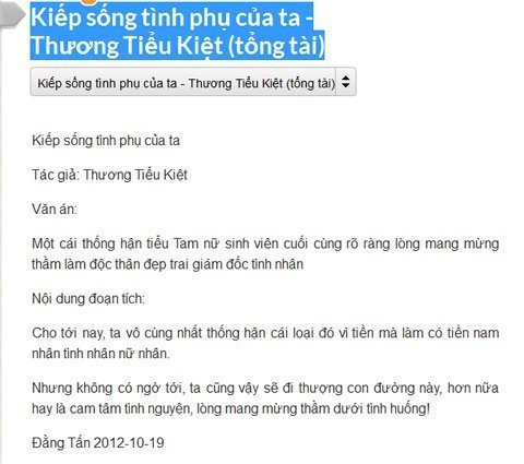 Sách ngôn tình xuất bản nhiều vô kể, la liệt tại các nhà sách, vậy mà teen vẫn phải tìm kiếm thêm những nguồn truyện thẳng từ Trung Quốc, tự dịch vội vàng bằng phần mềm convert và đăng tải trên các website này. Phổ biến nhất hiện nay là phần mềm dịch Quick Translate. Sản phẩm của phần mềm dịch thuật này thực sự "khó nuốt" với độc giả thông thường, nhưng với teen, dường như không quá khó khăn.Trong một tác phẩm có tên "Kiếp sống tình phụ của ta" - tác giả Thương Tiểu Kiệt, sau khi dịch qua phần mềm, người dịch chia sẻ lên website một bản dịch như sau: