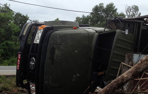 Chiếc ô tô biển đỏ lật nhào lúc đang chở hơn 20 quân nhân làm một người chết và hàng chục người bị thương.