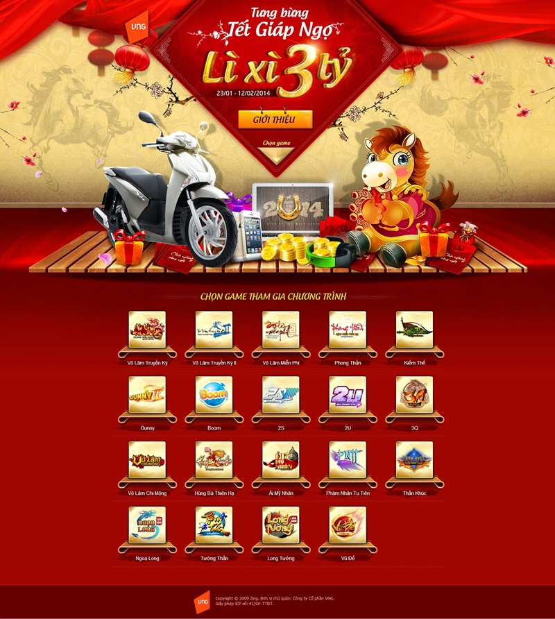 Chương trình diễn ra từ 23/01 đến 12/02/2014. Đúng như tên gọi, tổng giá trị các giải thưởng hiện vật may mắn của chương trình lên đến 03 tỷ đồng. Ngoài ra, Lì Xì 03 Tỷ còn có các phần thưởng là hàng triệu vật phẩm trong game phong phú.