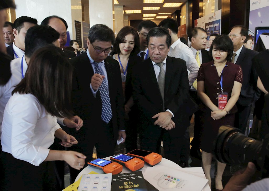 Phó Thống đốc NHNN ông Nguyễn Kim Anh cùng đoàn lãnh đạo NHNN Việt Nam nghe giới thiệu về sản phẩm máy bán vé xe khách tích hợp thanh toán QR Pay tại gian hàng của VNPAY. |