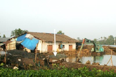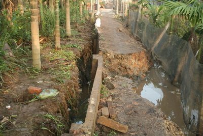 qua con hẻm kế cận lòn vào bên dưới bờ đê bê tông phá hủy một đoạn bờ bao gây