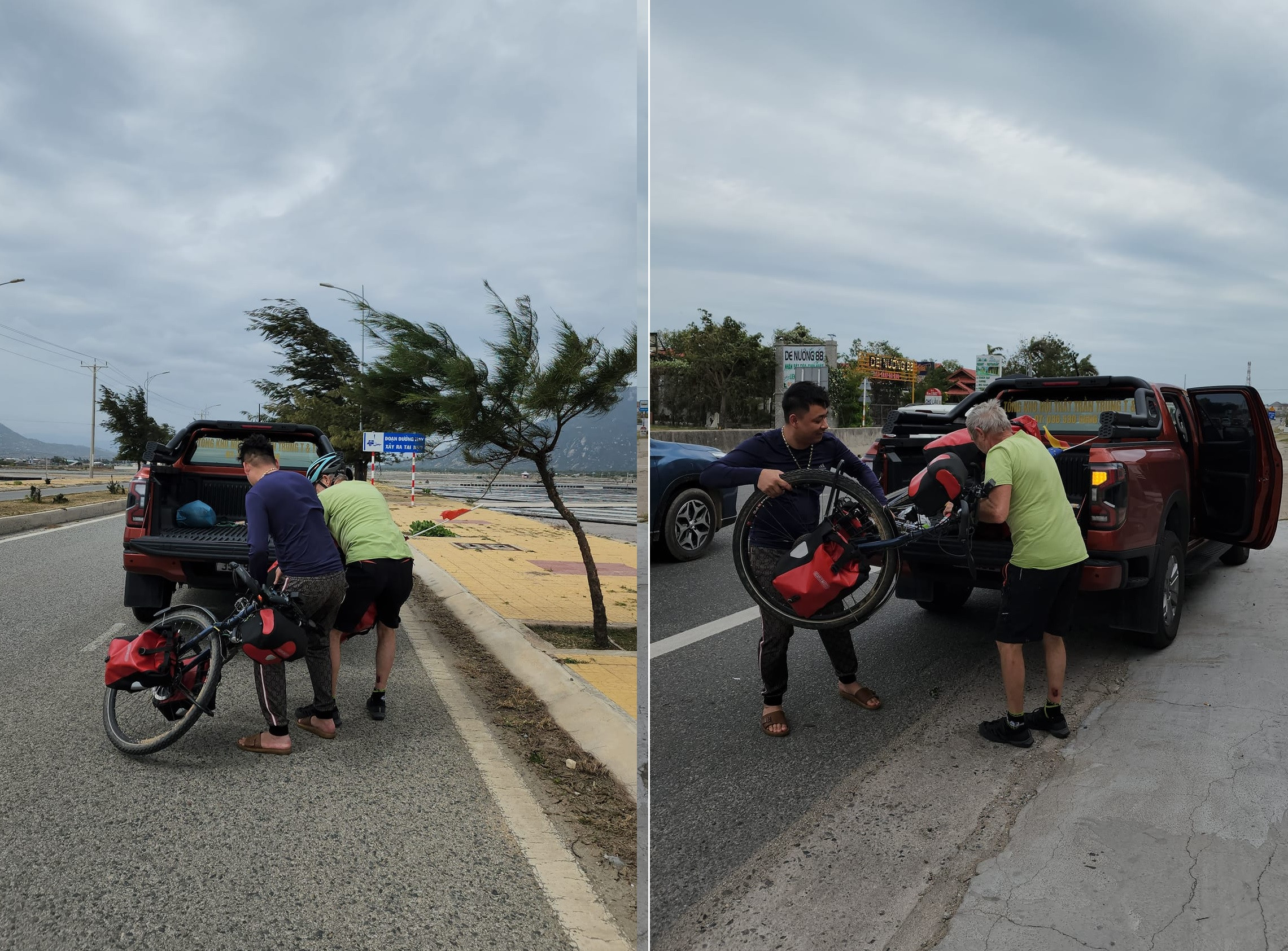 "Khi lên xe nói chuyện mình được biết vị khách đến từ nước Đức, đang đi xuyên Việt bằng xe đạp. Ông ấy bị ngã trầy xước chân tay, không thể đạp nổi xe, không còn sức đi vì gió lớn nơi đây", anh Trung kể lại.