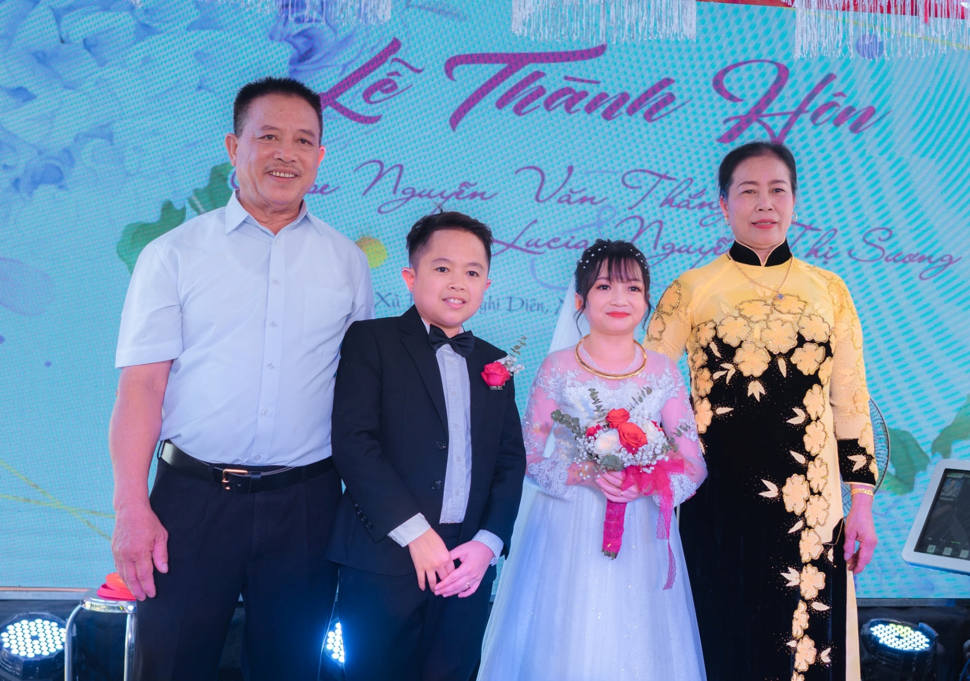 Trong lễ cưới, anh Thắng hạnh phúc gửi lời cảm ơn đến vợ. Anh nói: “Cảm ơn vợ, dù bao nhiêu sóng gió ập đến, vợ vẫn ở bên và nắm chặt tay chồng”.