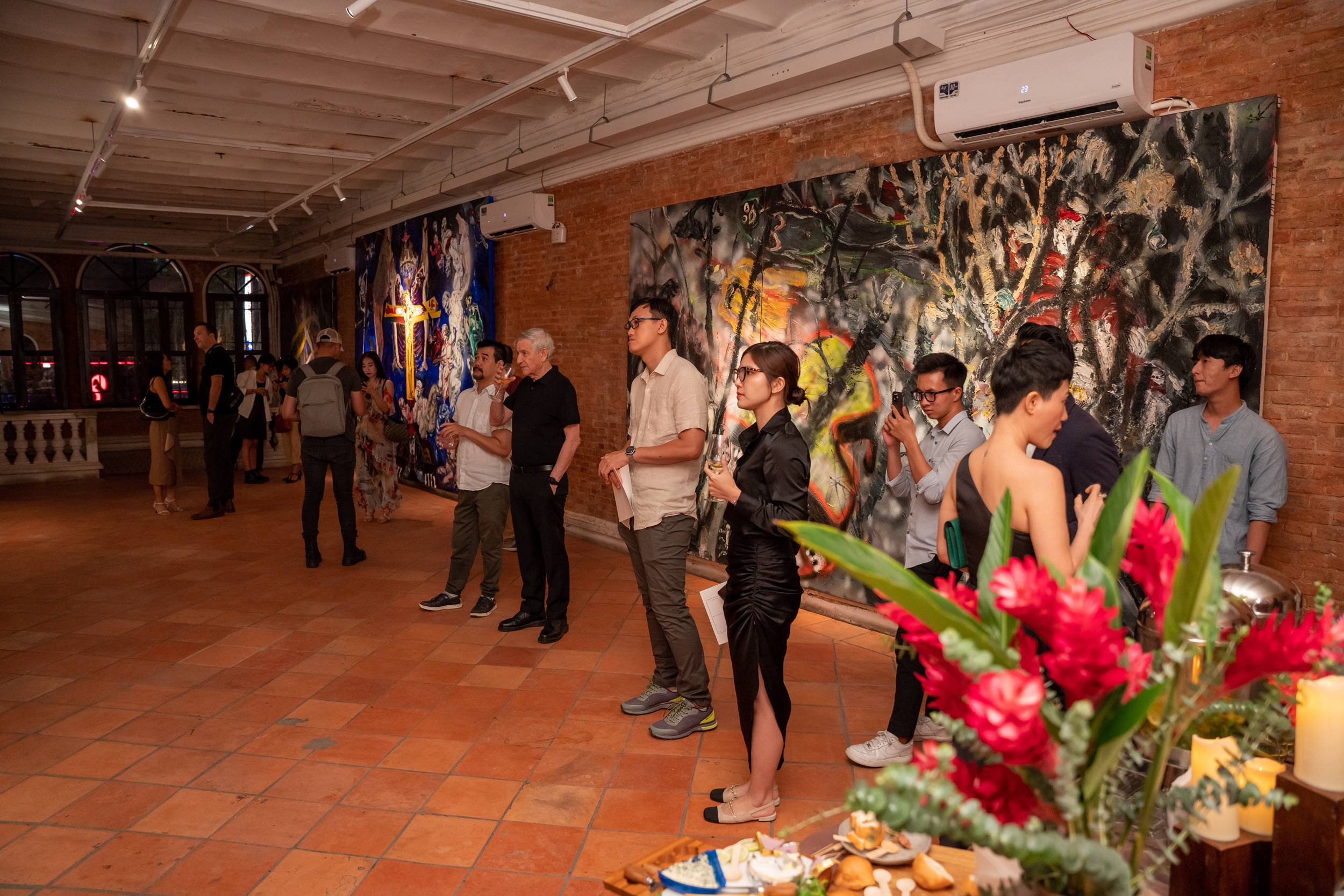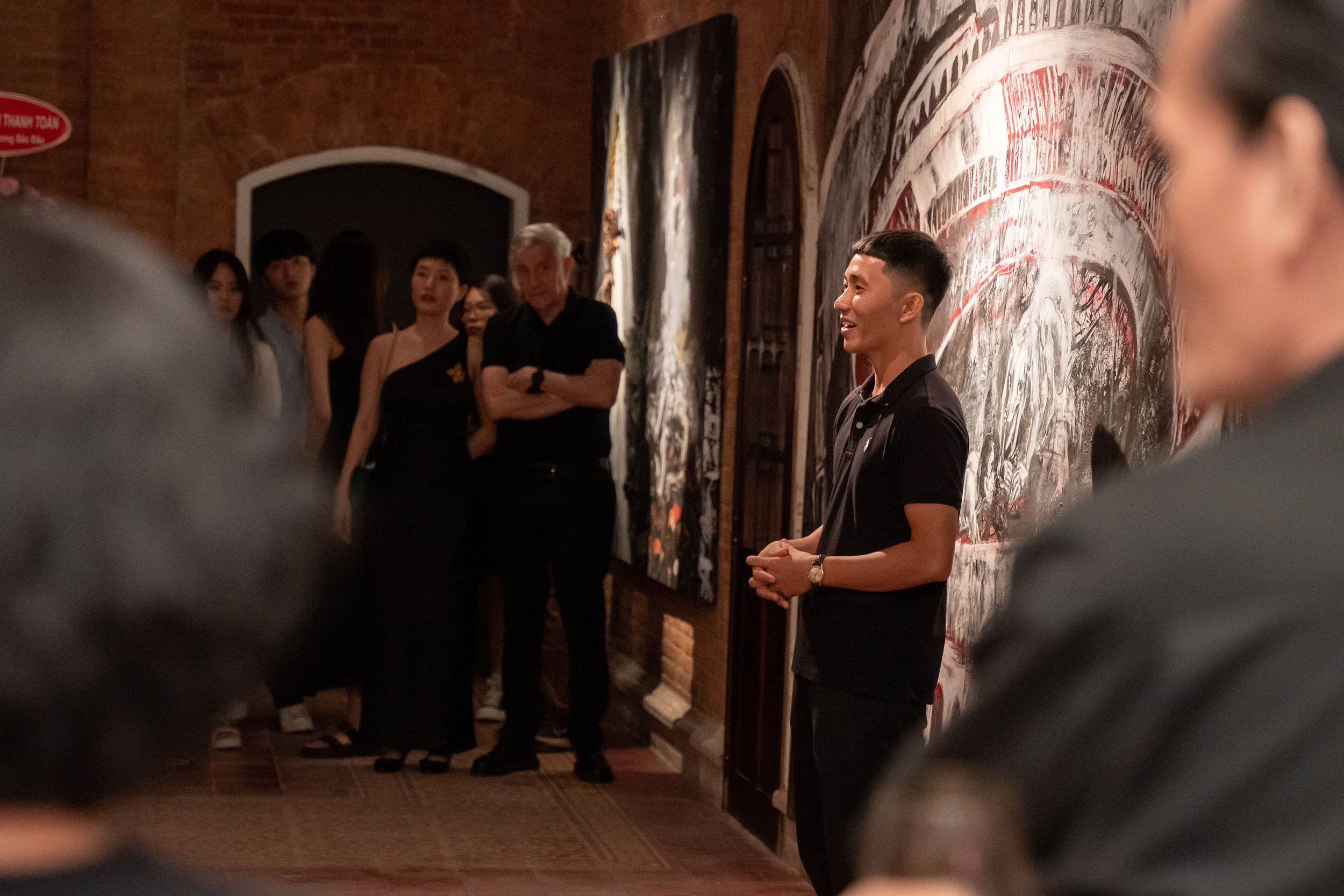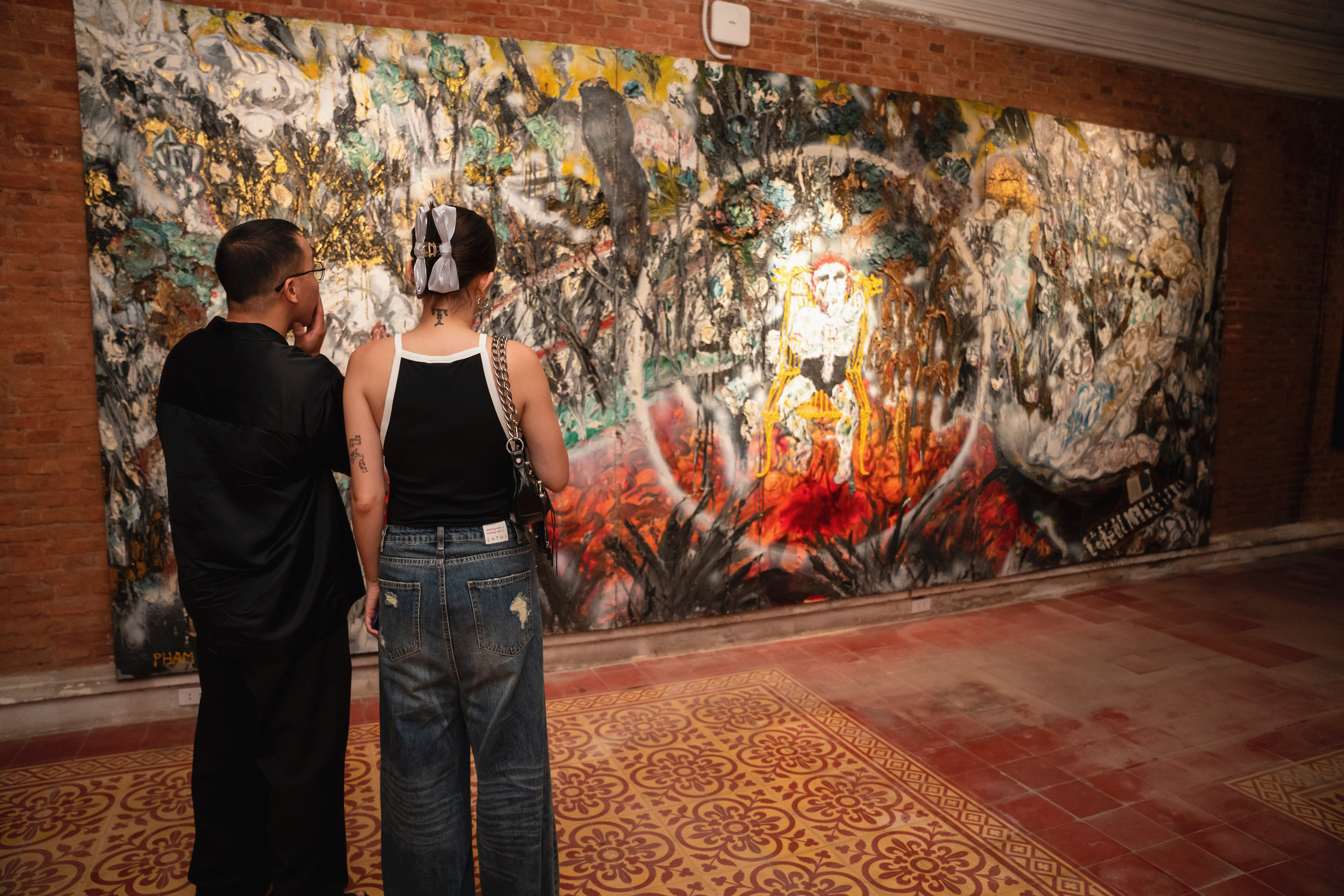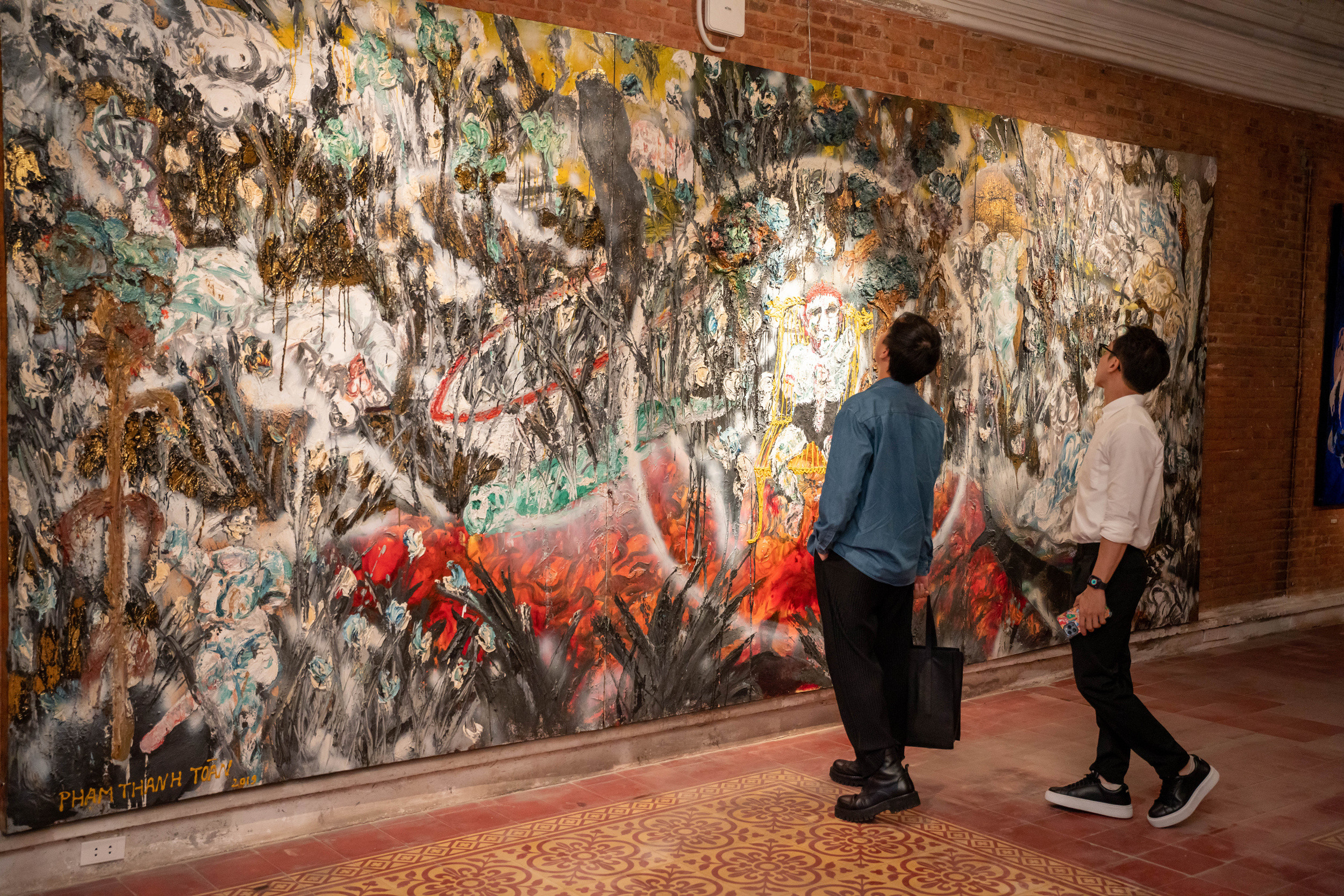Triển lãm tranh "Không gian khác" của họa sĩ Phạm Thanh Toàn diễn tại ngôi nhà cổ 130 năm tuổi ở TP.HCM thu hút nhiều người yêu hội họa, trong đó có vợ chồng ca sĩ Tóc Tiên."Không gian khác" phản ánh trí tưởng tượng của người họa sĩ trẻ về một tam giác giả tưởng hình thành xã hội loài người là tâm linh, tình yêu, các tác động xã hội... Các tác phẩm của Phạm Thanh Toàn không có chuỗi câu chuyện cố định. Giới chuyên môn nhận xét anh sáng tác theo bản năng, 'ngây ngô và cuồng nhiệt'.Triển lãm trưng bày 10 tác phẩm sơn dầu như: Bồn tắm cũ ngoài vườn, Cậu bé ngồi trong vườn nhà, Đấu trường La Mã, Giấc mơ... và 1 tác phẩm điêu khắc. Họa sĩ thường vẽ tranh khổ lớn (2-6m) với tầng tầng lớp lớp câu chuyện, nhân vật và thông điệp.Tranh Phạm Thanh Toàn có con người, sinh vật, đồ dùng của thế giới thực; các nhân vật trong Kinh thánh, thần thoại và vật dụng ở thế giới khác. Những hình ảnh như: hiệp sĩ, ngựa giấy, con quạ, nhà thờ, hàm cá mập đan xen với cầu vồng, chồng sách đổ, con thuyền dát vàng... là lát cắt về cuộc sống trong tâm trí của họa sĩ.Phạm Thanh Toàn vẽ thế giới hạnh phúc của riêng mình từ ám ảnh về âm và dương, sự sống, cái chết và luân hồi, khát vọng tự do, trò chơi vương quyền, sự phản biện mới và cũ... Anh thể hiện hoài niệm quá khứ với lòng trắc ẩn, tư tưởng tự do và hạnh phúc một cách bản năng."Sẽ có người nói tôi vẽ sai rồi, trong Kinh thánh, lịch sử không có nhân vật này, không có câu chuyện này nhưng tôi không kể chuyện hay phản ánh hiện tại. Đây là không gian được vẽ bởi trí tưởng tượng của một kẻ ngoại đạo đi lạc vào thế giới khác", Phạm Thanh Toàn nói.Họa sĩ khuyên người xem thả mình vào trí tưởng thay vì kiểm soát, dè chừng hay cố đoán ý của tác giả.Phạm Thanh Toàn sinh năm 1992, tốt nghiệp Đại học Mỹ thuật TP.HCM năm 2017. Từ năm 2014 đến nay, anh có 11 triển lãm, trong đó có 4 triển lãm cá nhân. Họa sĩ từng gây ấn tượng khi tham gia triển lãm nhóm tại New York, Mỹ và Young Art Festival tại Hàn Quốc. Triển lãm "Không gian khác" diễn ra đến hết ngày 28/5.
