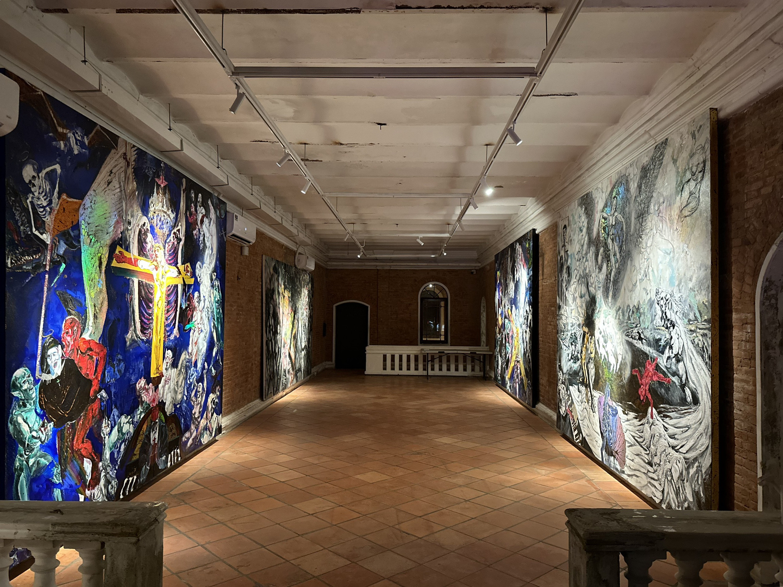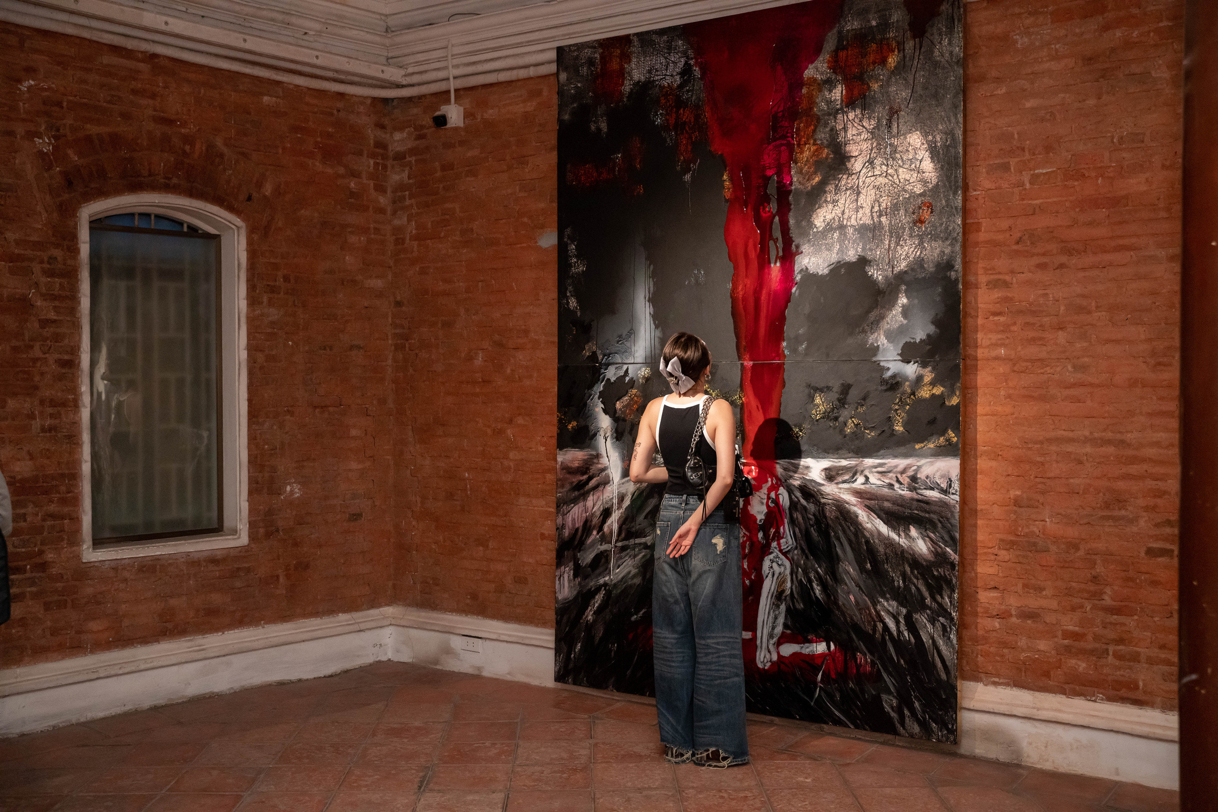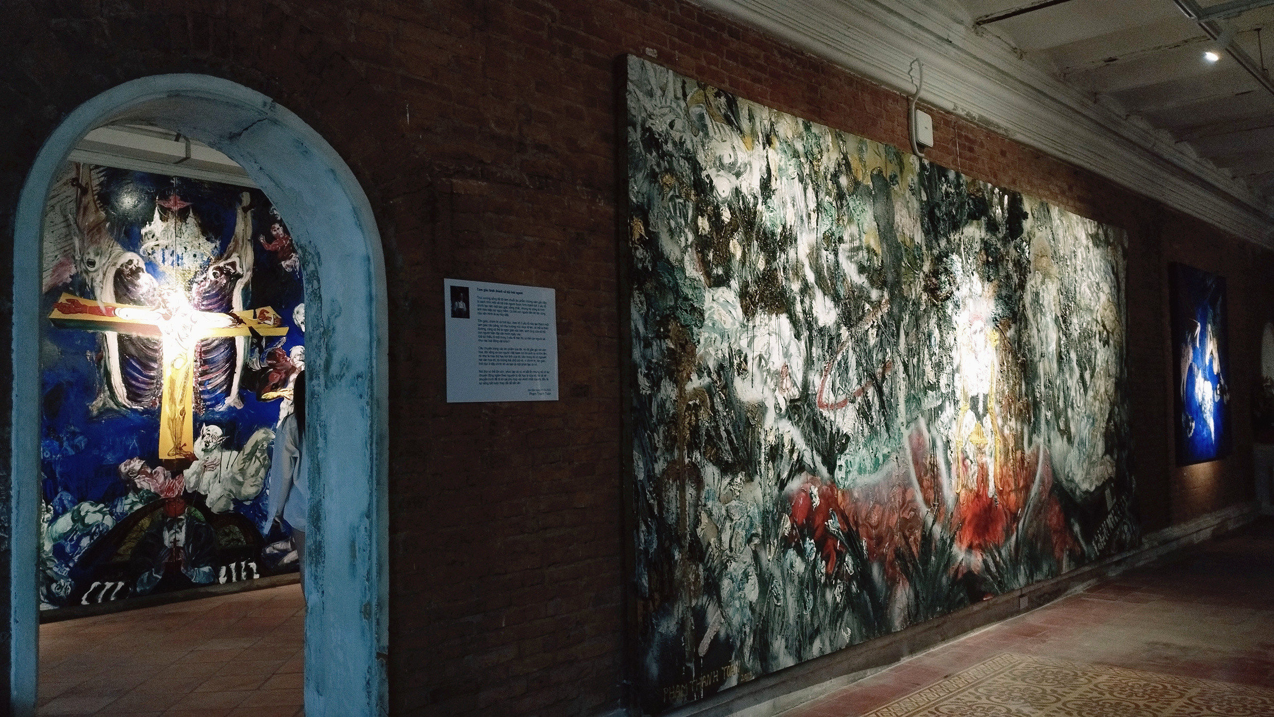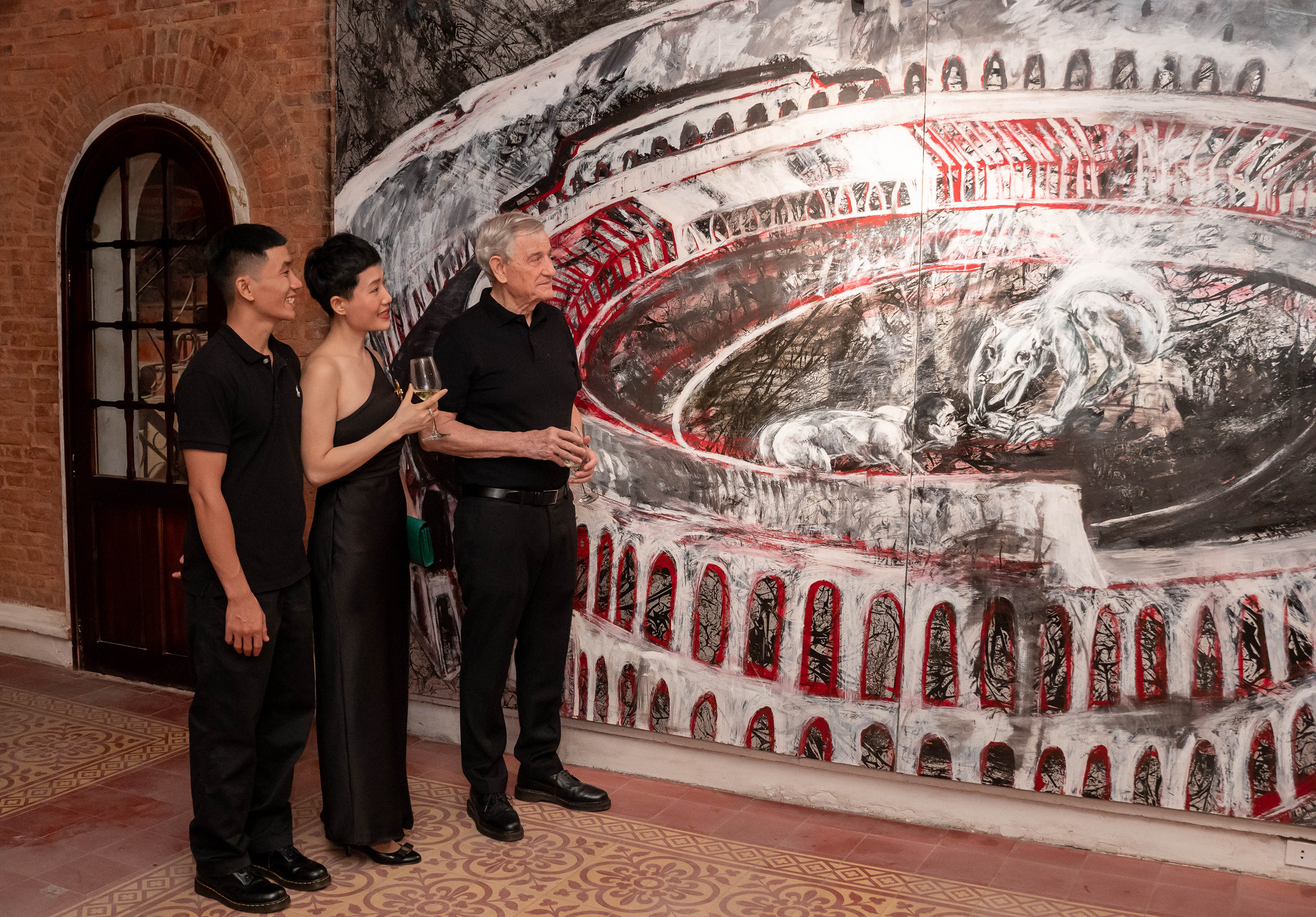 Triển lãm tranh "Không gian khác" của họa sĩ Phạm Thanh Toàn diễn tại ngôi nhà cổ 130 năm tuổi ở TP.HCM thu hút nhiều người yêu hội họa, trong đó có vợ chồng ca sĩ Tóc Tiên."Không gian khác" phản ánh trí tưởng tượng của người họa sĩ trẻ về một tam giác giả tưởng hình thành xã hội loài người là tâm linh, tình yêu, các tác động xã hội... Các tác phẩm của Phạm Thanh Toàn không có chuỗi câu chuyện cố định. Giới chuyên môn nhận xét anh sáng tác theo bản năng, 'ngây ngô và cuồng nhiệt'.Triển lãm trưng bày 10 tác phẩm sơn dầu như: Bồn tắm cũ ngoài vườn, Cậu bé ngồi trong vườn nhà, Đấu trường La Mã, Giấc mơ... và 1 tác phẩm điêu khắc. Họa sĩ thường vẽ tranh khổ lớn (2-6m) với tầng tầng lớp lớp câu chuyện, nhân vật và thông điệp.Tranh Phạm Thanh Toàn có con người, sinh vật, đồ dùng của thế giới thực; các nhân vật trong Kinh thánh, thần thoại và vật dụng ở thế giới khác. Những hình ảnh như: hiệp sĩ, ngựa giấy, con quạ, nhà thờ, hàm cá mập đan xen với cầu vồng, chồng sách đổ, con thuyền dát vàng... là lát cắt về cuộc sống trong tâm trí của họa sĩ.Phạm Thanh Toàn vẽ thế giới hạnh phúc của riêng mình từ ám ảnh về âm và dương, sự sống, cái chết và luân hồi, khát vọng tự do, trò chơi vương quyền, sự phản biện mới và cũ... Anh thể hiện hoài niệm quá khứ với lòng trắc ẩn, tư tưởng tự do và hạnh phúc một cách bản năng."Sẽ có người nói tôi vẽ sai rồi, trong Kinh thánh, lịch sử không có nhân vật này, không có câu chuyện này nhưng tôi không kể chuyện hay phản ánh hiện tại. Đây là không gian được vẽ bởi trí tưởng tượng của một kẻ ngoại đạo đi lạc vào thế giới khác", Phạm Thanh Toàn nói.Họa sĩ khuyên người xem thả mình vào trí tưởng thay vì kiểm soát, dè chừng hay cố đoán ý của tác giả.Phạm Thanh Toàn sinh năm 1992, tốt nghiệp Đại học Mỹ thuật TP.HCM năm 2017. Từ năm 2014 đến nay, anh có 11 triển lãm, trong đó có 4 triển lãm cá nhân. Họa sĩ từng gây ấn tượng khi tham gia triển lãm nhóm tại New York, Mỹ và Young Art Festival tại Hàn Quốc. Triển lãm "Không gian khác" diễn ra đến hết ngày 28/5.