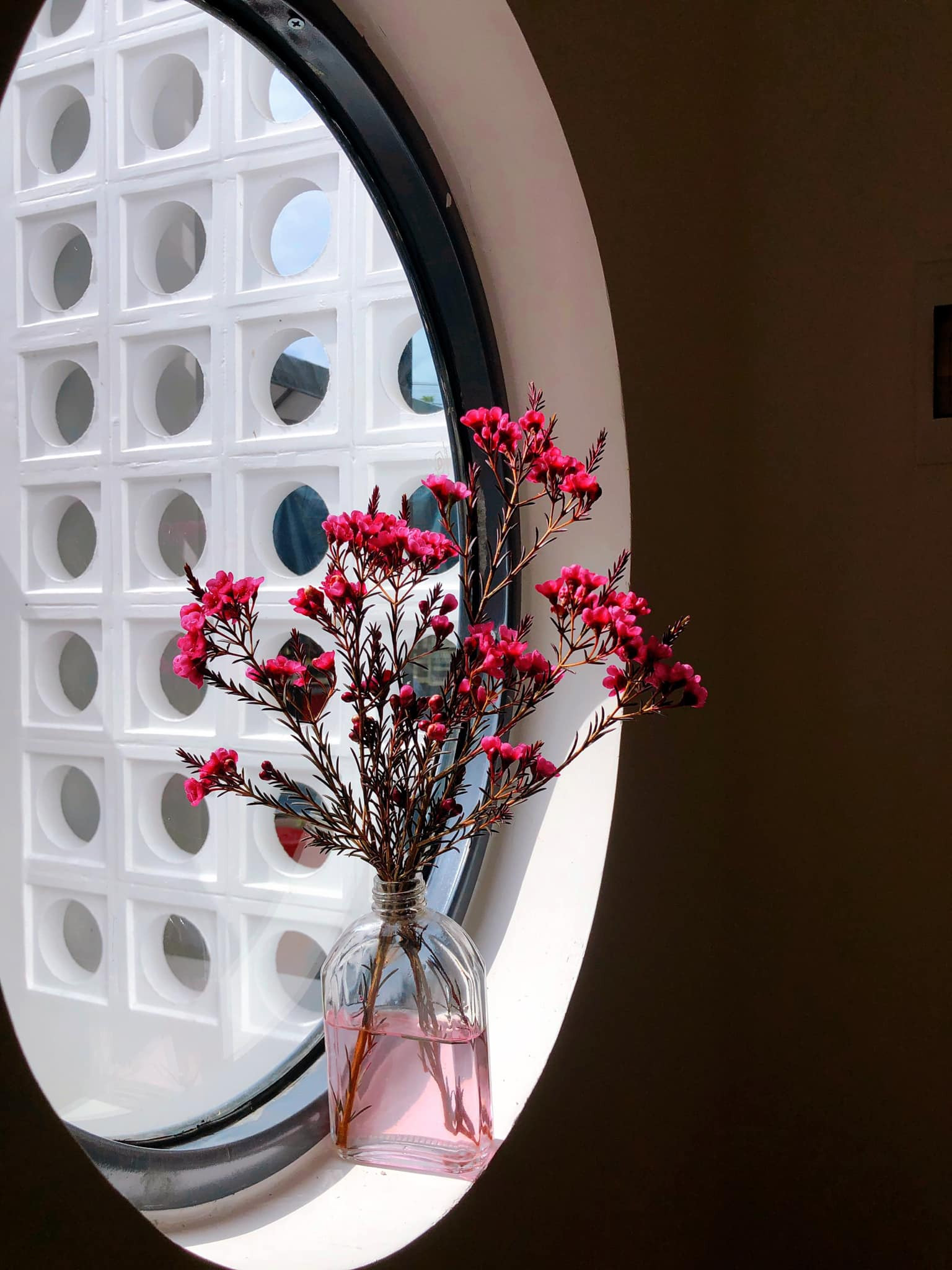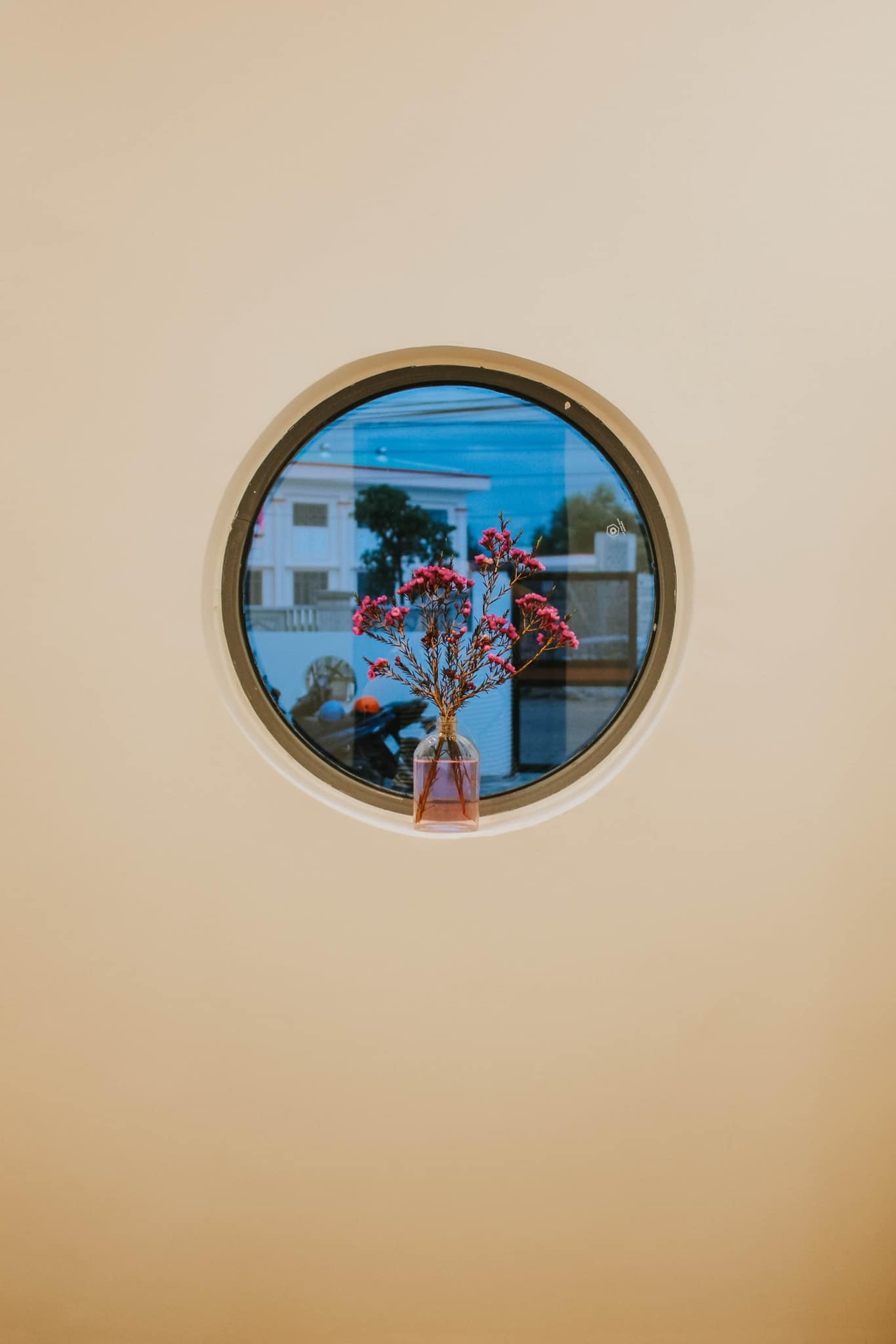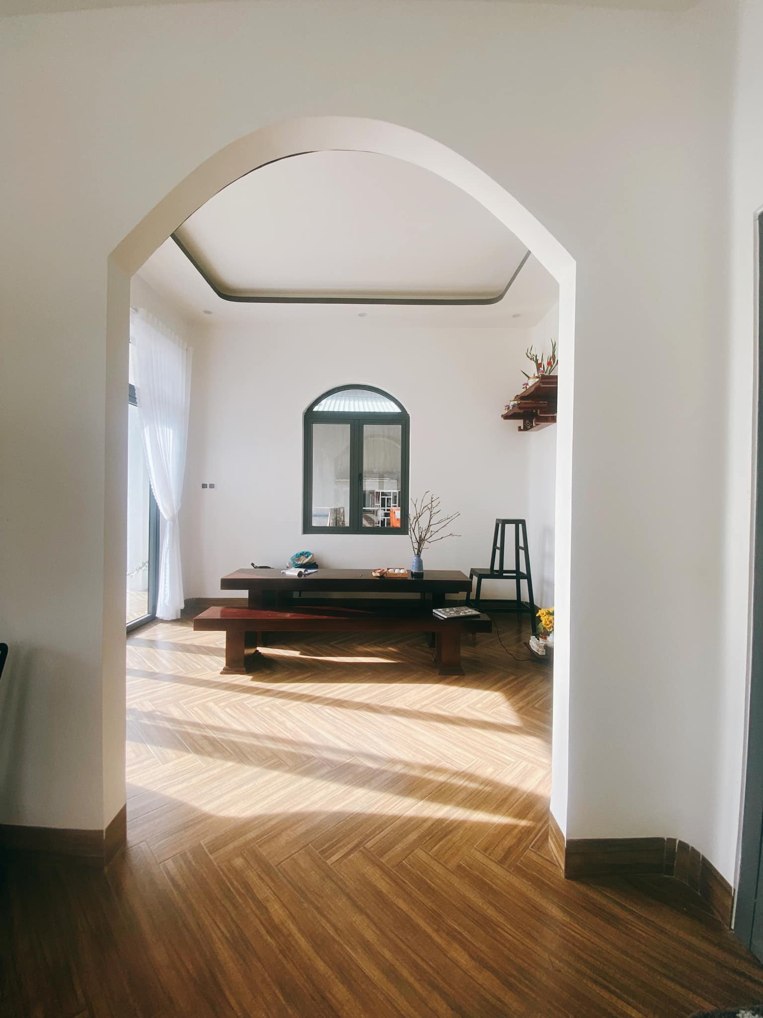 Ô cửa sổ tròn ngay góc bàn làm việc. Chị hay cắm hoa và xông trầm ở đây. Chị thích nhiều cửa sổ bằng kính để nhà lúc nào cũng đầy nắng. Riêng chi phí cho hệ thống cửa trong nhà khi hoàn thiện hết khoảng 70 triệu đồng.