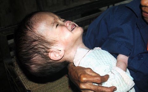 Chị Nga cho biết, khi mới sinh ra cháu cũng bình thường, được hai tháng thì thấy cháu có biểu hiện nóng sốt, co giật nên đưa cháu di khám ở Bệnh viện đa khoa Hà Tĩnh. Tại đây, bác sĩ cho biết cháu bị bệnh não úng thủy, gia đình nên đưa cháu ra Hà Nội chữa trị. Mặc dù vậy, vì không có tiền nên vợ chồng chị Nga đành cho cháu về nhà.