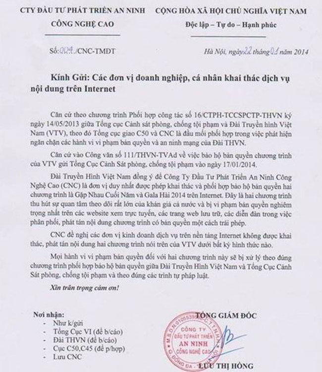 Theo công văn này VTV đã đồng ý để CNC là đơn vị duy nhất được phép khai thác và phối hợp bảo vệ bản quyền hai chương trình Gặp nhau cuối năm và Gala hài 2014 trên Internet. Đây là 2 chương trình thu hút sự quan tâm theo dõi rất lớn của khán giả cả nước và bị vi phạm bản quyền nghiêm trọng nhất trên các website xem trực tuyến, các trang web lưu trữ, các diễn đàn trong việc phân phối, phát tán nội dung chương trình có bản quyền trái phép.
