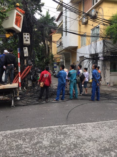 Hình ảnh EVN dọn dẹp mạng cáp tại phố Lạc Trung sáng 4/5/2019. Ảnh VTC cung cấp |