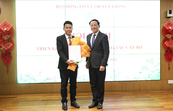 | Thứ trưởng Bộ TT&TT Phạm Anh Tuấn trao quyết định cho ông Dương Tôn Bảo (Ảnh: Đức Huy) |