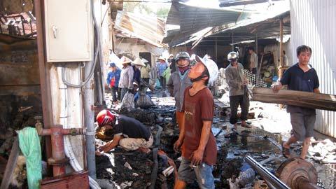 | Hiện trường đám cháy sáng 22/6, nhiều tiểu thương đang vật lộn giữa đống hoang tàn, đổ nát. |