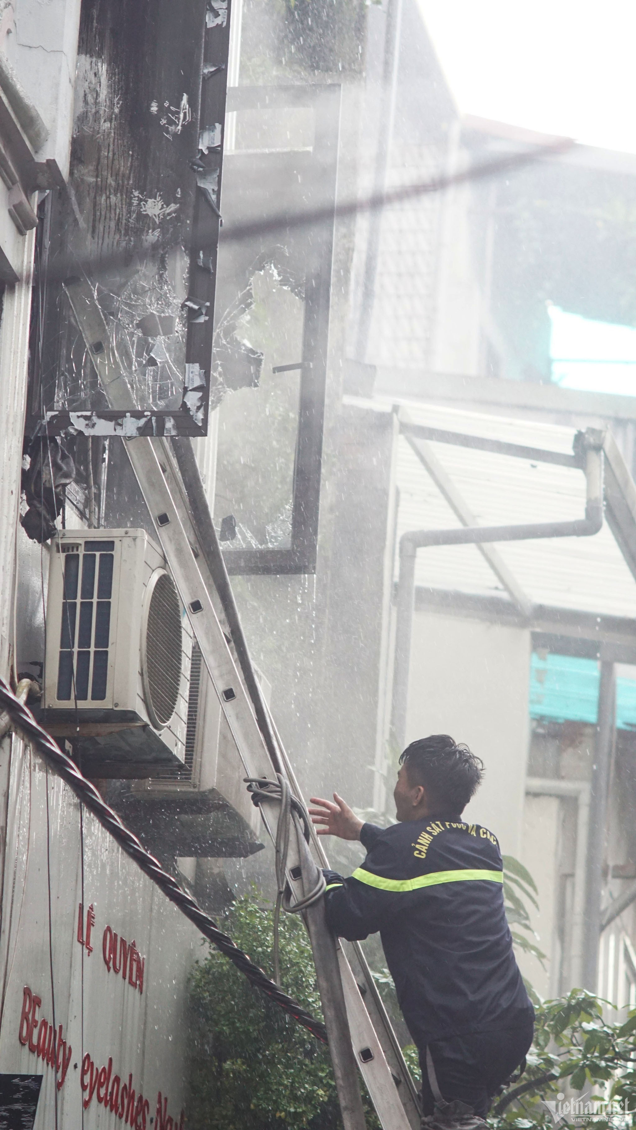 "Do nhiệt cao khiến gạch lát cầu thang và lan can bị sụp xuống, khi lực lượng cứu hộ bước lên thì bị trượt ngã", hạ sĩ Nguyễn Đức Anh kể.