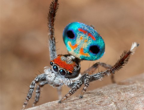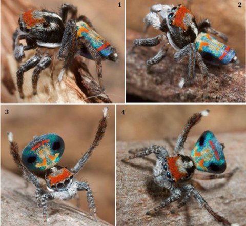 Giống như chim công, các con nhện công đực cũng có màn phô diễn vẻ đẹp sặc sỡ của cơ thể nhằm thu hút những con cái trong mùa giao phối.