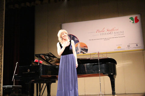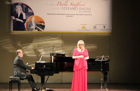 Đêm hòa nhạc kỉ niệm ngày quốc khánh Italia diễn ra tối mùng 2/6 tại Nhà hát lớn Hà Nội chứng kiến màn trình diễn xuất sắc của nữ danh ca Paola Stafficci và khách mời Vũ Mạnh Dũng - giọng bass bariton (nam trung trầm) của Nhà hát nhạc vũ kịch Việt Nam.