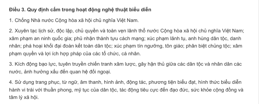 Vì các lý do trên, Cục Nghệ thuật Biểu diễn đánh giá nội dung trên có dấu hiệu vi phạm quy định cấm “sử dụng trang phục, từ ngữ, âm thanh, hình ảnh, động tác, phương tiện biểu đạt, hình thức biểu diễn hành vi trái với thuần phong, mỹ tục của dân tộc, tác động tiêu cực đến đạo đức, sức khỏe cộng đồng và tâm lý xã hội” tại khoản 4 Điều 3 Nghị định số 144/2020/NĐ-CP ngày 14/12/2020 của Chính phủ quy định về hoạt động nghệ thuật biểu diễn. Vì vậy, ngay lập tức, phải có biện pháp dừng lưu hành sản phẩm này.