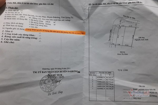 Nhiều năm trôi qua, mới đây người dân vô tình phát hiện trong sổ đỏ có ghi: Nguồn gốc sử dụng: Công nhận quyền sử dụng đất như giao đất không thu tiền sử dụng đất. Từ đó, người dân cho rằng sổ đỏ của họ không cần nộp tiền sử dụng đất nhưng hai cán bộ trên lại thu tiền của họ là không đúng. Hơn nữa, việc thu tiền không có biên lai là không rõ ràng.