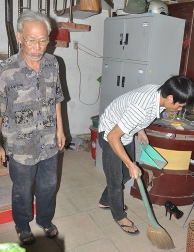 | Ông Nguyễn Mạnh Tường (trái). Nhân viên tiệm vàng (phải) tiến hành dọn dẹp |