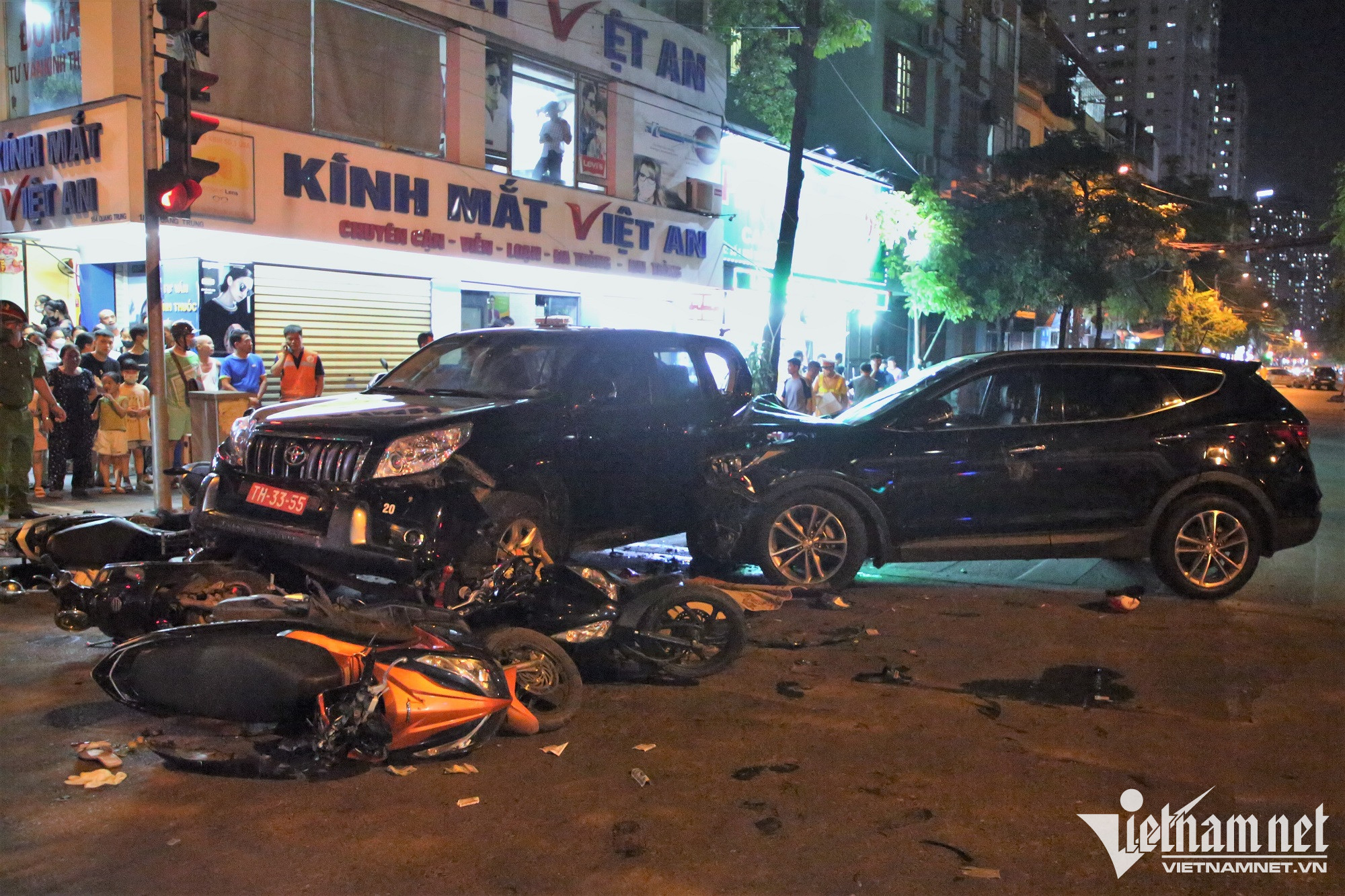 Trước đó, khoảng 20h45 ngày 28/7, vụ tai nạn liên hoàn xảy ra tại phố Ngô Thì Nhậm (quận Hà Đông). Khi đó, xe SantaFe do ông Hà Thanh Hưng (SN 1977, tạm trú tại phường La Khê, Hà Đông) đâm liên hoàn vào ô tô biển đỏ, taxi 5 chỗ và ô tô bán tải, 6 xe máy.