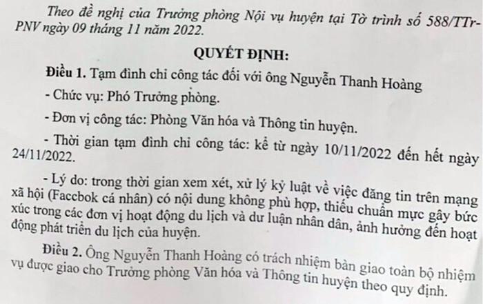 Quyết định tạm đình chỉ công tác do Chủ tịch UBND huyện Phong Điền Nguyễn Trung Nghĩa ký nêu: “Trong thời gian xem xét, xử lý kỷ luật về việc đăng tin trên mạng xã hội có nội dung không phù hợp, thiếu chuẩn mực gây bức xúc trong đơn vị hoạt động du lịch và dư luận nhân dân, ảnh hưởng đến hoạt động phát triển du lịch của huyện”.