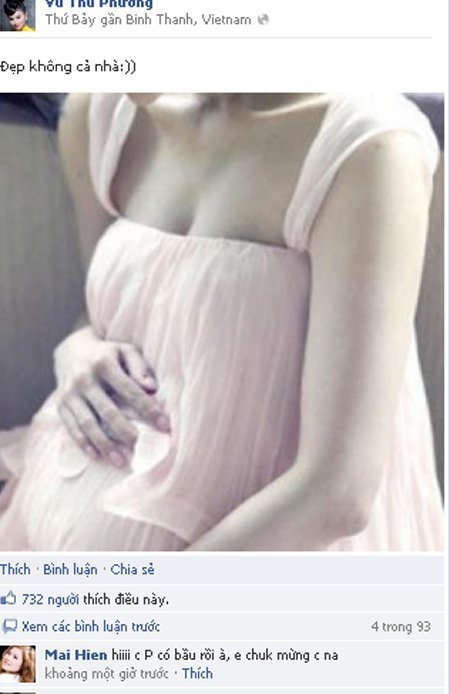 Đăng kèm theo bức ảnh trên trang cá nhân, Vũ Thu Phương còn kèm theo status "Đẹp không cả nhà". Rất nhiều comment hỏi thăm, chúc mừng đã được gửi tới Vũ Thu Phương nhưng người đẹp vẫn quyết định không bật mí chuyện mình sắp đón thiên thần nhỏ.