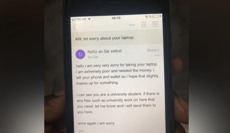 Đó là trường hợp của một sinh viên sống tại Birmingham - Anh bị mất laptop. Sau đó, người này bất ngờ nhận được một email xin lỗi từ kẻ trộm. Anh ta phân trần rằng đang rất túng quẫn nên mới liều lĩnh đánh cắp chiếc laptop.