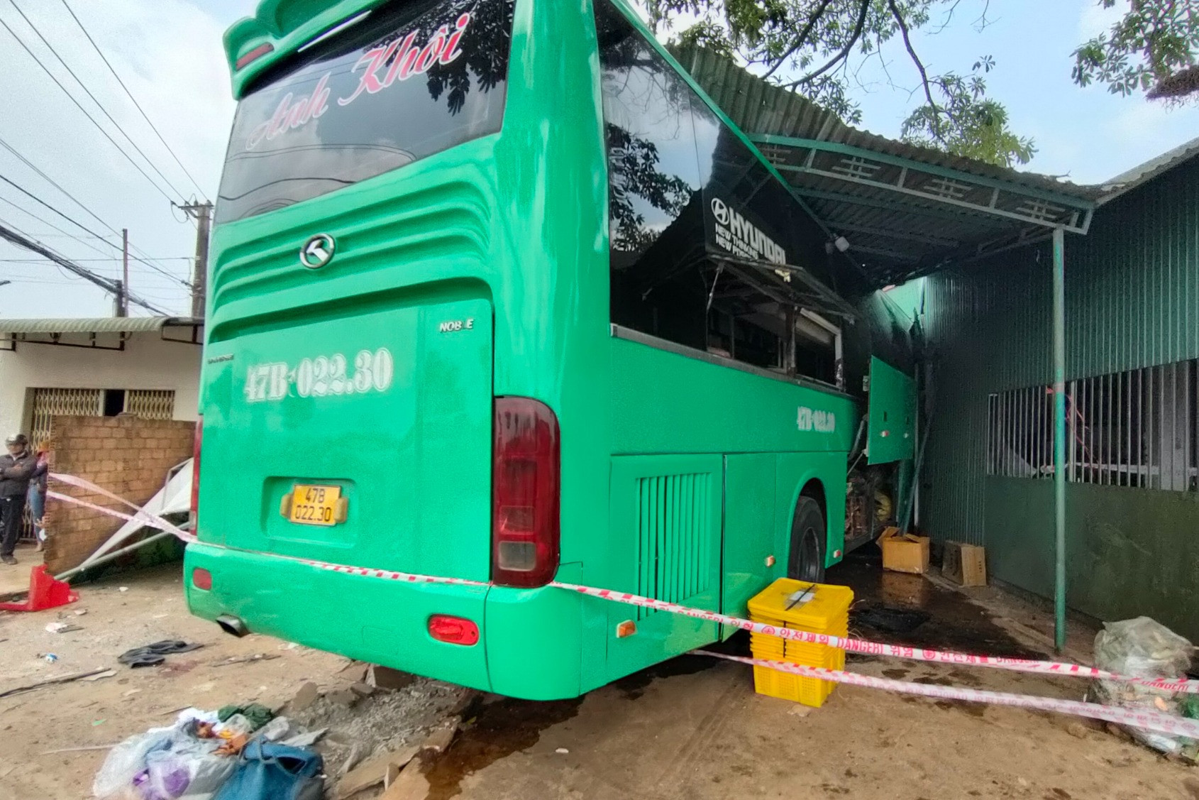 Tại hiện trường, xe khách hư hỏng nặng phần đầu, một phần tường nhà dân sập đổ.