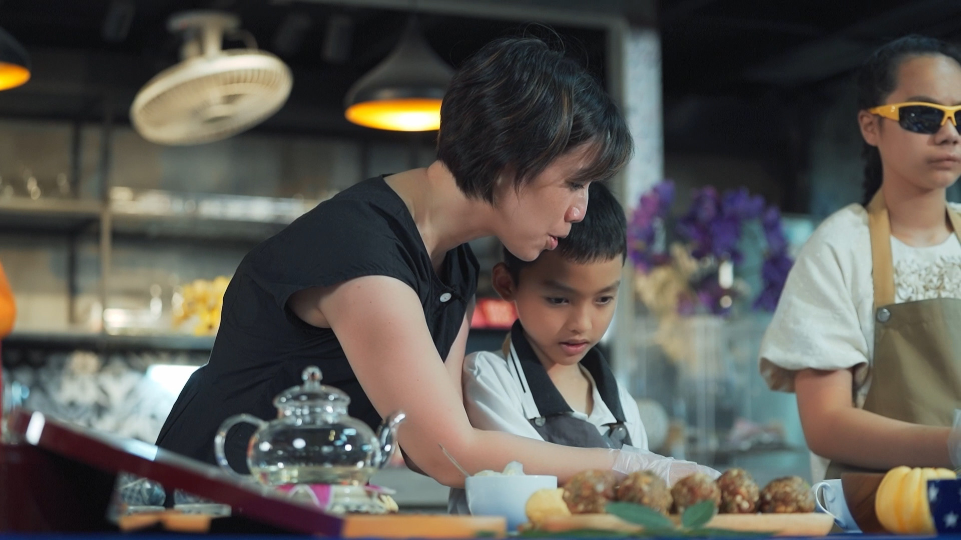 Khó khăn nhất với các bạn nhỏ khiếm thị khi làm bánh là tìm ra vị trí của các nguyên liệu. Nữ đầu bếp hướng dẫn các em cách sắp xếp ngăn nắp nhất, cảm nhận mùi hương để phân biệt. Cô liên tục truyền cảm hứng và khích lệ các bạn nhỏ vào bếp dù có khiếm khuyết về thị lực.