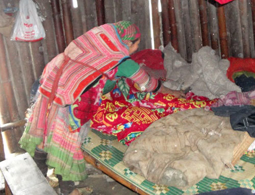 Bước vào ngôi nhà “đặc biệt” ấy, tôi ngỡ ngàng với người đàn bà 41 tuổi, mà trông như bà lão 65 tuổi. Chị đang xay ngô, lưng địu đứa bé chừng một tuổi. Ngồi cạnh bếp là anh Chớ, mang khuôn mặt khắc khổ, già nua như ông cụ 60. Khuôn mặt của anh chẳng ăn khớp gì với cái tuổi 47.