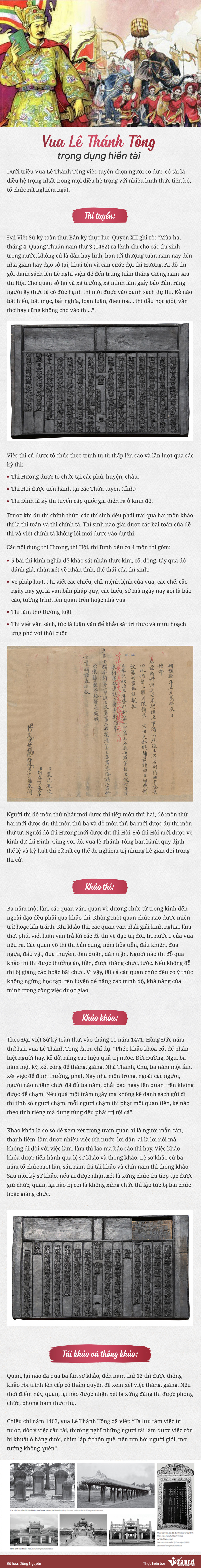 Dưới triều Vua Lê Thánh Tông việc tuyển chọn người có đức, có tài là điều hệ trọng nhất trong mọi điều hệ trọng với nhiều hình thức tiến bộ, tổ chức rất nghiêm ngặt.