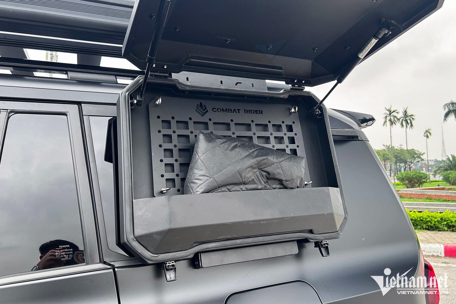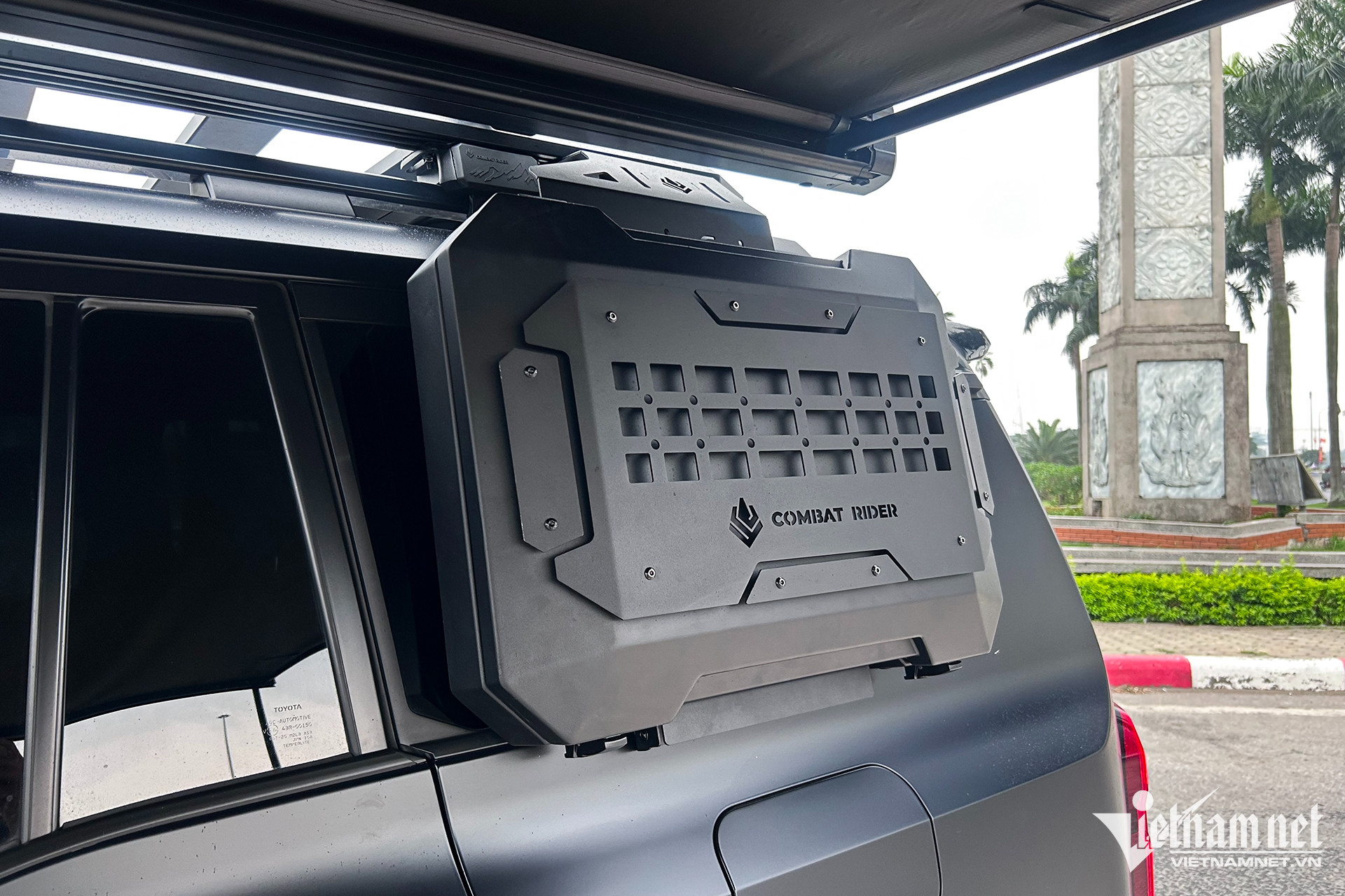 Ngoài ra, chủ xe còn nâng cấp thêm một số phụ kiện khác cho chiếc Land Cruiser Prado để phục vụ sở thích đi cắm trại. Những món đồ này đều đến từ thương hiệu Combat Rider, bao gồm một giá nóc tích hợp thang rút, hộp chứa lều bạt cùng một lán che có thể đóng/mở và gấp gọn trên nóc xe.