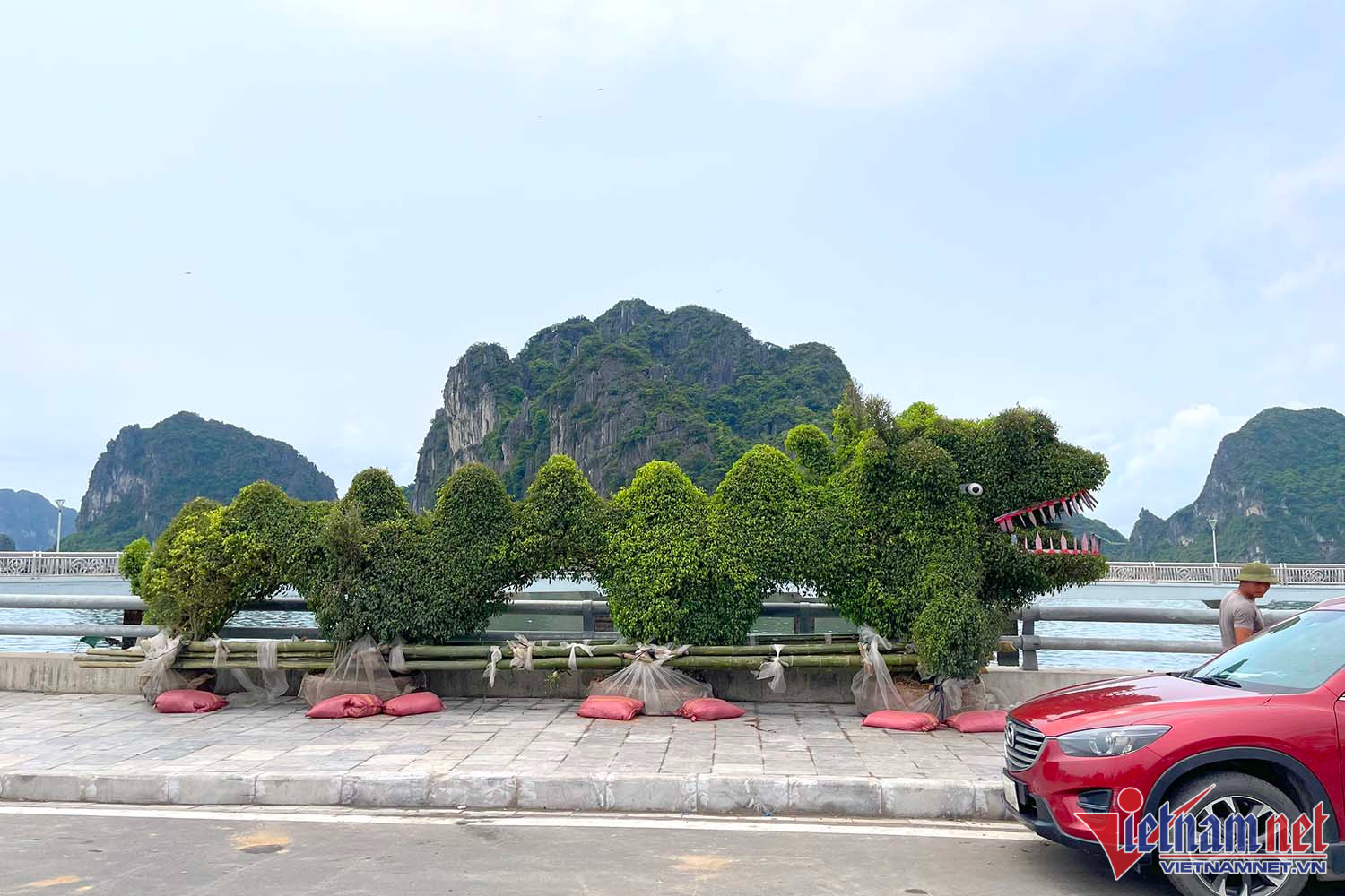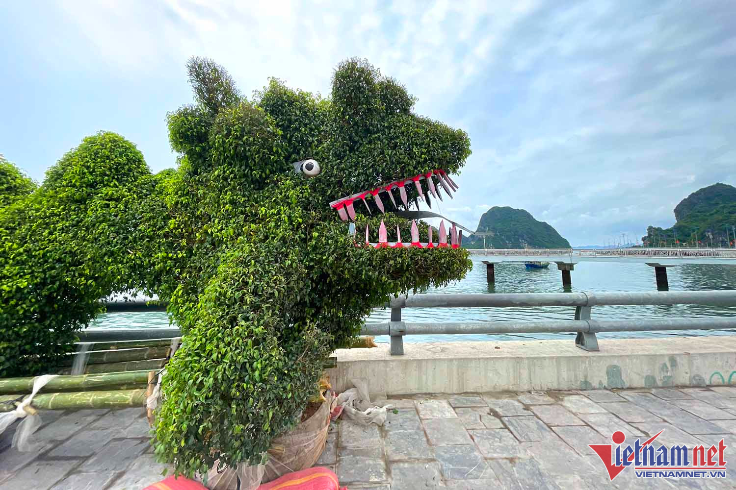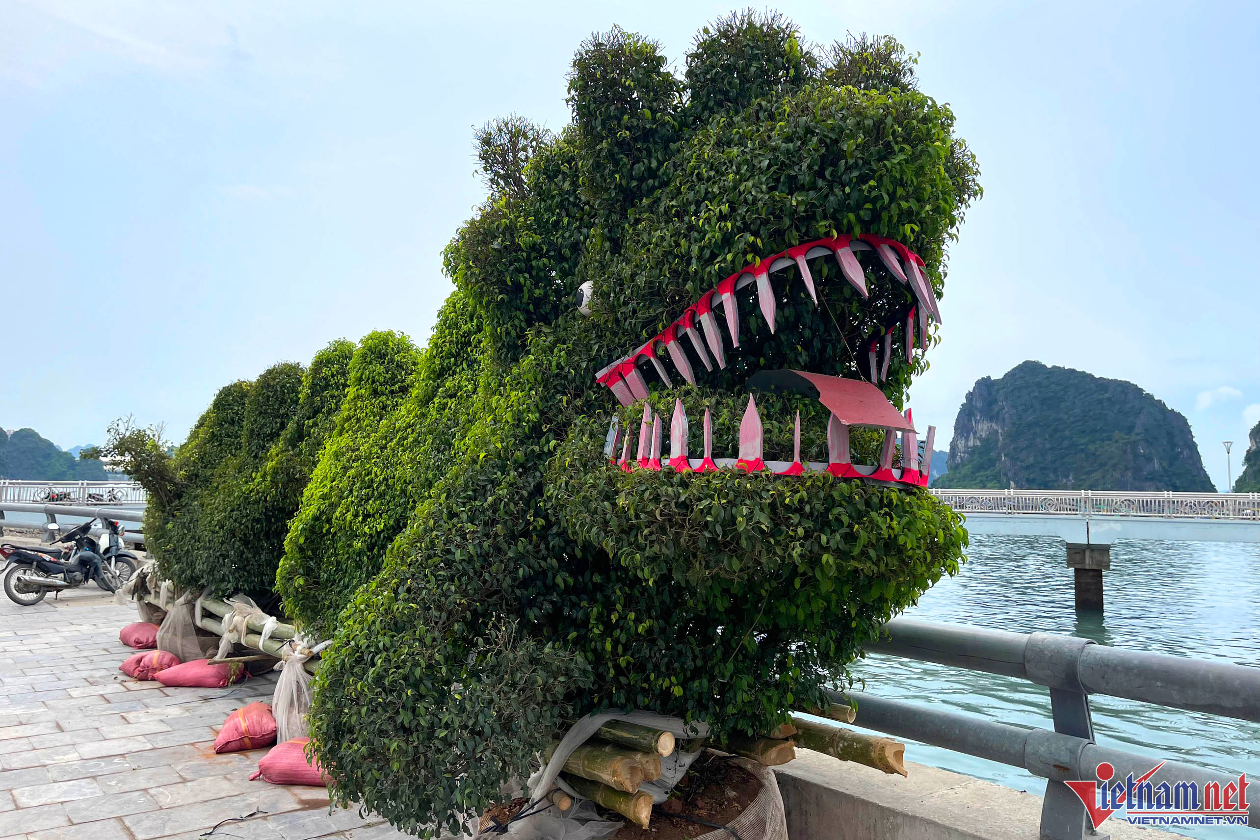 Sáng nay (28/4), tại khu vực đường bao biển Trần Quốc Nghiễn (gần cầu Bài Thơ, TP Hạ Long) xuất hiện 2 bụi cây duối cảnh được cắt xén, tạo hình giống con rồng, đặt đối xứng nhau trên vỉa hè.