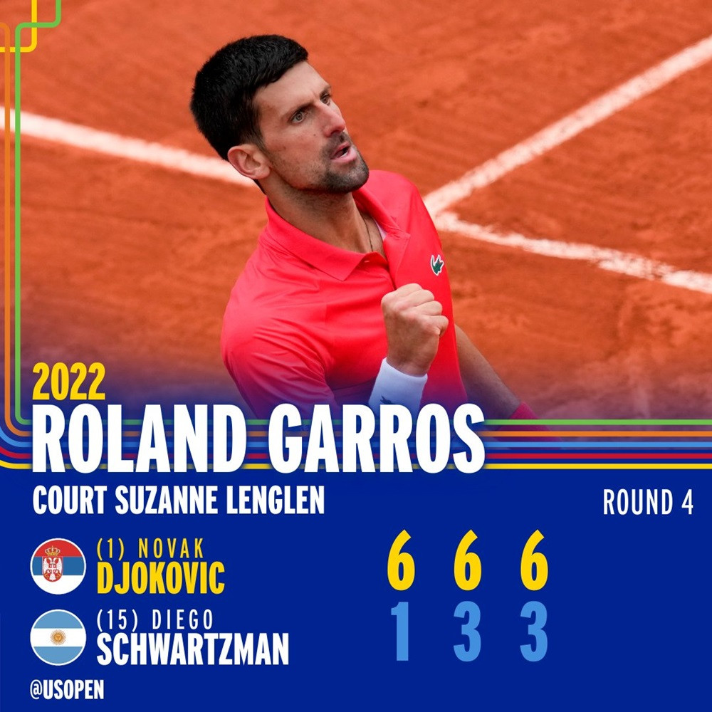 Dễ dàng vượt qua Diego Schwartzman với tỷ số 6-1, 6-3, 6-3, Novak Djokovic lần thứ 13 góp mặt ở vòng tứ kết Roland Garros.