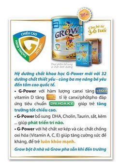 Abbott Nutrition tại Việt Nam vừa giới thiệu đến người tiêu dùng dòng sản phẩm mới Grow G-Power (cho trẻ từ 3-6 tuổi) và Grow School G-Power (trẻ đi học từ 6 tuổi trở lên) được phát triển dựa trên nghiên cứu khoa học với Hệ dưỡng chất khoa học G-Power mới chứa 32 dưỡng chất thiết yếu giúp phát triển xương, não bộ cũng như sự phát triển toàn diện của cơ thể trẻ. Hệ dưỡng chất khoa học G-Power chứa hàm lượng canxi tăng +10%, vitamin D tăng +60%, tỉ lệ canxi/phốtpho đáp ứng tiêu chuẩn DRI Hoa Kỳ giúp trẻ tăng trưởng tốt chiều cao. G-Power bổ sung DHA, Cholin, Taurin, sắt, kẽm... giúp phát triển trí não và hệ chất xơ kép và các chất chống oxy hóa (Vitamin A, C, E) giúp tăng cường sức đề kháng, để trẻ luôn khỏe mạnh Grow bột ở nhà và Grow pha sẵn khi đến trường