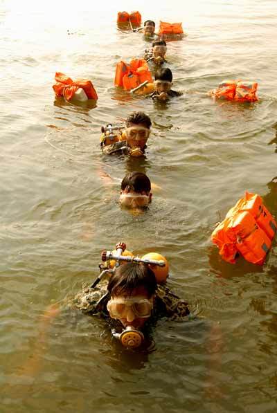 | Các chiến sĩ đặc công thuộc đội 4, đoàn M26 huấn luyện bơi chiến thuật có khí tài |