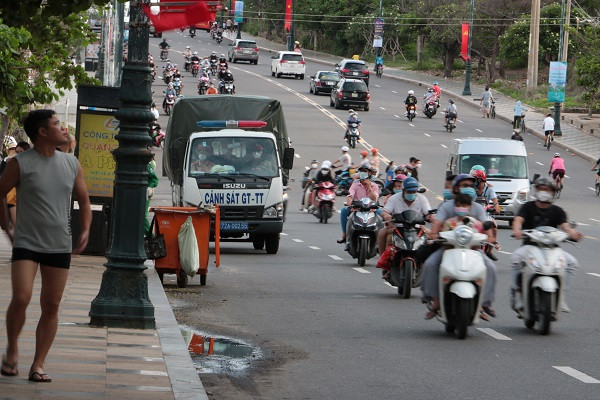 Dọc tuyến đường ven biển Thùy Vân, Quang Trung xe của lực lượng CSGT-TT TP Vũng Tàu liên tục di chuyển để nhắc nhở, xử lý các trường hợp đậu, đỗ không đúng quy định.