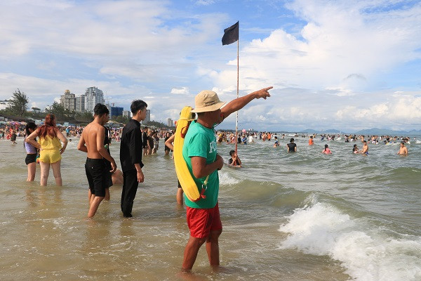 Dưới bãi biển, để đảm bảo an toàn cho du khách tắm mát, 100% lực lượng cứu hộ túc trực thường xuyên, cắm biển cảnh báo tại vị trí ao xoáy, nguy hiểm.