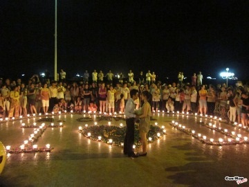 Công việc được hoàn tất với sự chu đáo, cẩn thận của chủ nhân vào lúc 19h30. Đến khoảng 20h30, trước sự chứng kiến của hàng trăm bạn trẻ và người dân hiếu kỳ, chàng trai đưa bạn gái vào vòng trái tim. Được sự động viên của đám đông, chàng trai đã quỳ xuống, tặng hoa và thì thầm lời yêu thương, trao nhẫn cho bạn gái của mình.