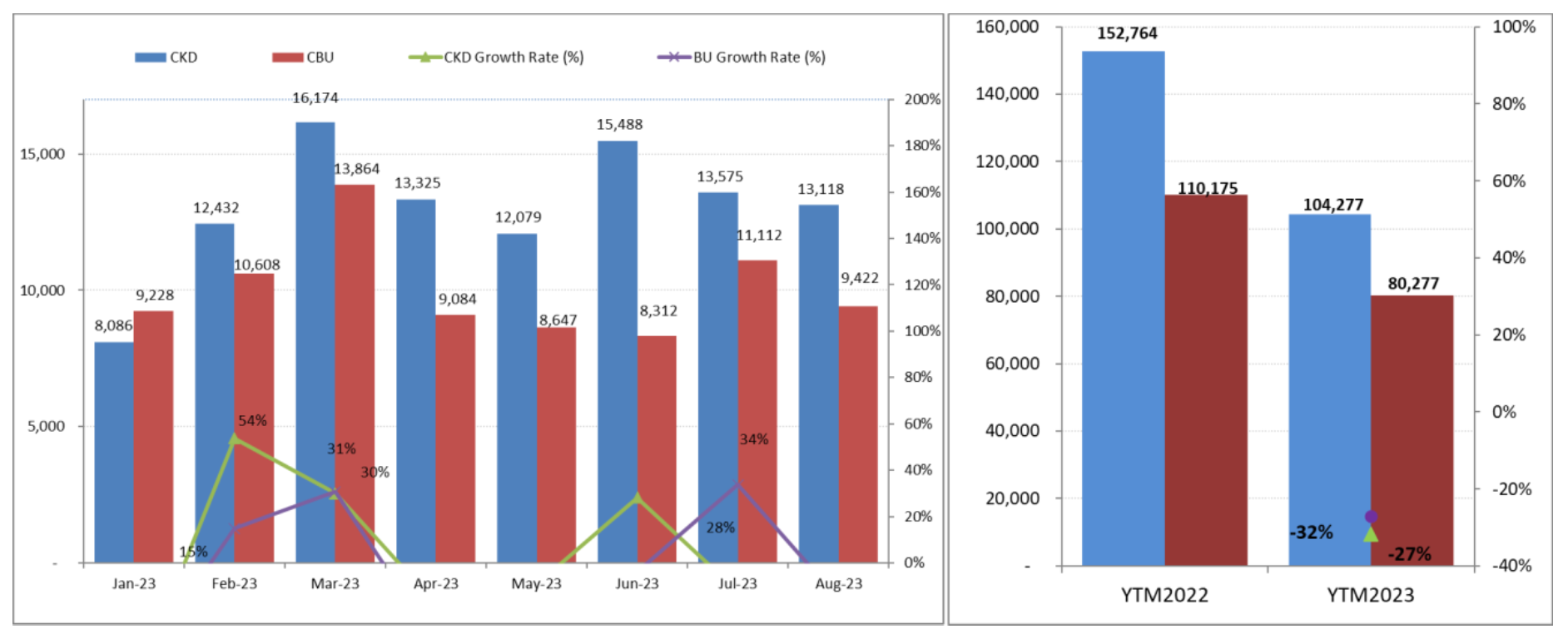 Trong tổng số 22.540 xe đã bán được trong tháng 8 theo báo cáo VAMA, doanh số của xe lắp ráp trong nước đạt 13.118 xe (giảm 3% so với tháng trước) và xe nhập khẩu nguyên chiếc là 9.422 xe (giảm 15%)