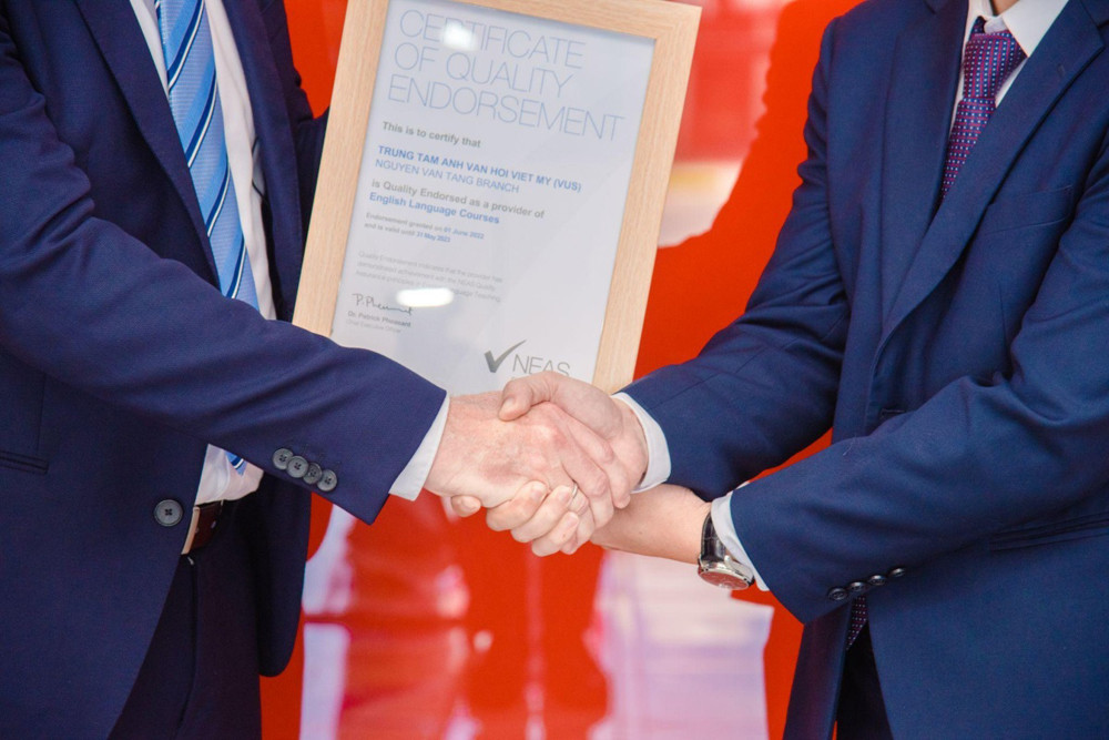 Tháng 6 vừa qua, ông Patrick Pheasant - Tổng Giám đốc NEAS đã kiểm định trực tiếp tại 7 cơ sở của VUS, bao gồm cả những cơ sở mới nhất: Lê Trọng Tấn, Nguyễn Ảnh Thủ 2, Đỗ Xuân Hợp, Nguyễn Văn Tăng, Dĩ An, Tô Ký 2 và Nguyễn Văn Thủ. Ông Patrick cũng trao bằng chứng nhận chuẩn quốc tế cho 7 cơ sở trong chuyến ghé thăm.